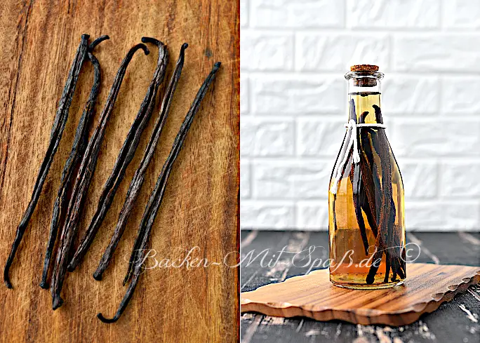 - Mit der Zeit, wenn der Vanilleextrakt weniger wird, kann man etwas Alkohol nachgießen und eine neue Vanilleschote hinzufügen oder die vorhandenen Schoten quer halbieren, damit sie kürzer sind und vollständig im Alkohol liegen.
