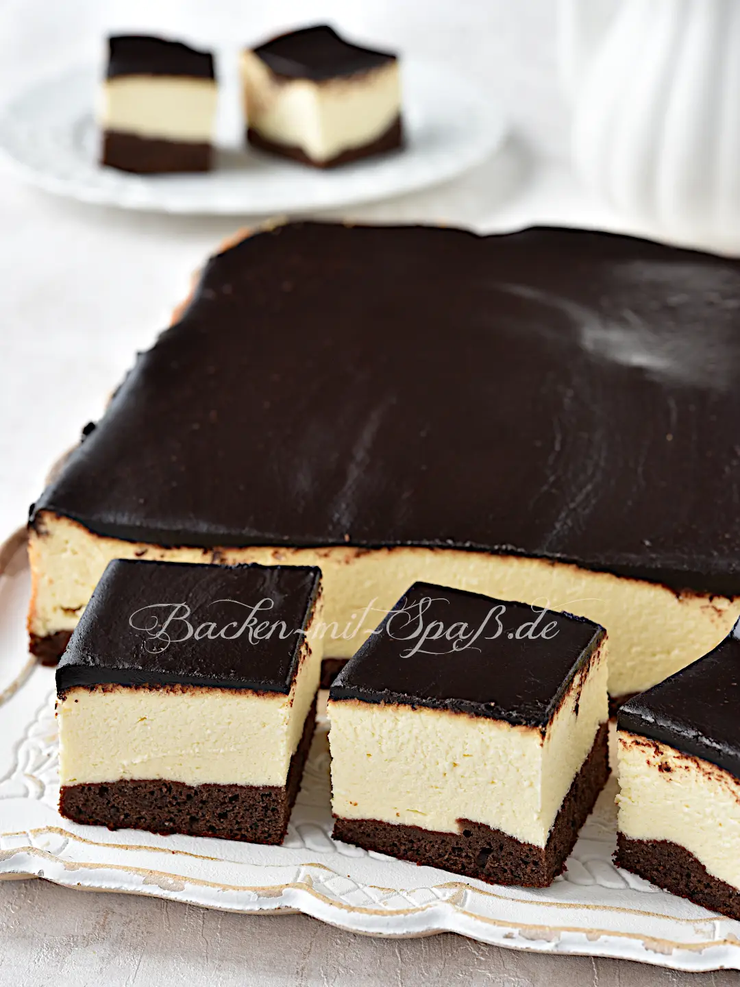 Der Käsekuchen besteht aus einem weichen, dunklen Rührteigboden, einer klassischen Käsemasse aus echtem Twaróg und einer einfachen Schokoladenglasur. Durch seine kompakte Konsistenz lässt er sich hervorragend schneiden, und der weiche Boden harmoniert perfekt mit der schweren Käsefüllung. Früher wurde der Käsekuchen fast immer mit Margarine gebacken - deswegen erwähne ich diese Möglichkeit ebenfalls im Rezept - aber ich selbst benutze seit Jahren ausschließlich Butter mit 82% Fett.
