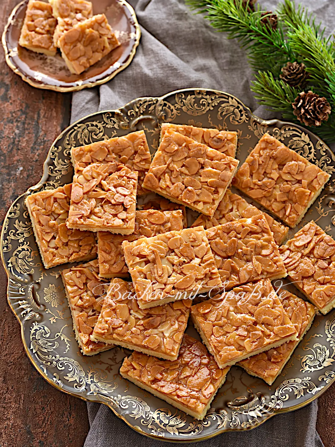 Plätzchen inspiriert vom bekannten Kuchen Bienenstich. Sowohl der klassische Kuchen als auch diese Plätzchen-Version haben den charakteristischen Honig-Mandel-Belag - genau dieser verleiht ihnen ihren Namen.